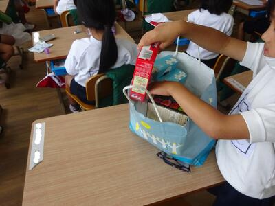 登校している1年生が袋いっぱいに空き箱や空き缶などを持ってきていました。「ずこうのざいりょうかな?」ときくと「はい」との返事。