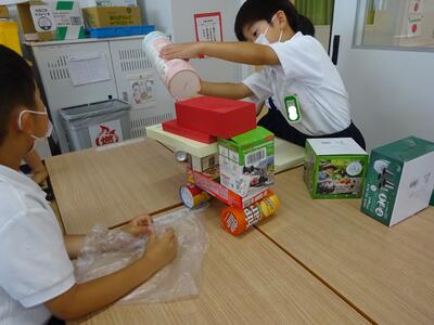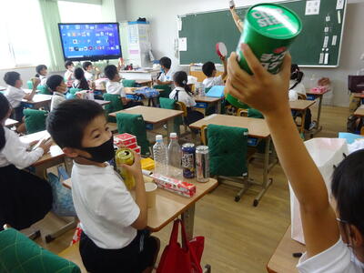 早速、1時間目の1年生教室から楽しそうな声が聞こえてきていました。家からもってきた色々な箱や筒などを出して見せ合っていました。この日のためにお家の人も一緒になってあつめてくれだろうと想像できる数です。ありがたいかぎりです(アルコールの空き缶もいろんな種類が・・)。