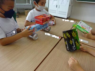 3年生の理科は、主幹教諭の一安先生(長く中学校で理科を担当)が担当しています。今の学習は「風とゴムの力のはたらき」です。多目的室で風で動く車を使った観察、実験を行っていました。子ども達は、風の力の大きさによる進む距離の違いなどの活動を行っていました。