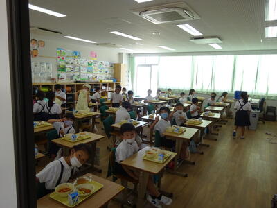 配膳後の各教室からは、あまった「ナン」争奪でじゃんけんをする声が聞こえていました。今日の給食は、いつも以上に楽しんだようでした。
