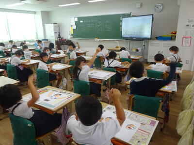 講師の方「国民の3つの義務は?」との質問に、多くの手があがった6年生、さすがです。税金がなくなった社会を描いたアニメを視聴した後、税のしくみや使われ方など自分達の生活と重ねがらら説明を受けていました。