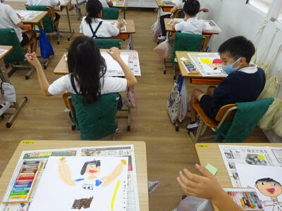 図工の時間の様子で、電子黒板には、運動会でのダンスの様子がうつされ、黒板には「うんどうかのえをかこう」と書かれていました。確かに子ども達の机上には画用紙があり、子ども達が運動会の絵を描いています。