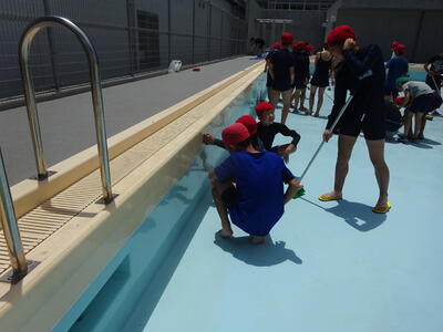先週には、中学校が25mプールの掃除を先行して行ってくれましたが、今日は、6年生が小プールの掃除を行いました。1組2時間目、2組3時間目、3組4時間目と3クラスで分担をして低学年が主に使う小プールの約1年間の汚れをきれいに落としてくれました(本校のプールは防火用水も兼ねています)。