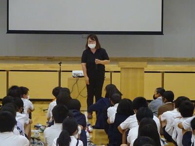 小島さんからは「横断歩道では、止まる・右左右・待つ」を行うように繰り返し話がありました。また、合志市内や県内での小学生の交通事故についても具体的に話があり、子ども達も改めて交通安全について確認ができたようでした。