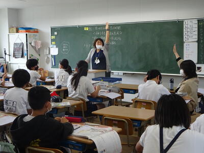 今日は、4年2組で授業をされる菊陽北小学校の水野桂子先生と協力者の菊之池小学校の岩下和子校長先生が来校され、5時間目は2組担任の桑原先生の授業参観、6時間目には水野先生が道徳の授業を行われました。「『正直』五十円分」という題材をもとに「正直に行動することのよさって何だろう」をテーマに考えていく授業内容でしたが、子ども達は様々な考えを出し合いながら、水野先生の授業を受けていました。