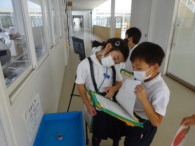 来週、1年生が生活科の学習で「がっこうたんけん」を行う際の「案内役!」として2年生の各クラスで学校探検に向けた下見を行っています。保健室や職員室のほか、1・2年生では使うことのないパソコン室や理科室(2階)、図工室や音楽室(3階)を班に分かれてじっくり下見です。「先輩!」として1年生にうまく説明したり、ちょとだけお世話をしたりすることになるのだと思います。