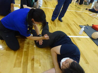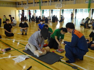 心肺蘇生では①安全確認、②反応(意識)確認、③119番通報と協力者への依頼、④呼吸の確認、⑤胸骨圧迫、⑥人工呼吸、⑦AED使用、⑧AEDの使用と心肺蘇生の継続について、実際に体験しながら確認をしていきました。