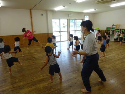 水分補給、防止着用、遊ぶ際にマスクをはずすなど、外遊びをしていますが、熱中症対策、コロナ対策、体力維持や向上、子ども達の楽しみ・・などなど状況を見ながら教育活動を進めています。