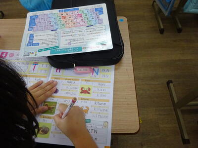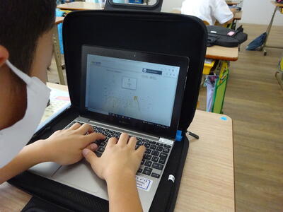 3年生の国語ではローマ字を学習しています。今まで同様、書いて練習をしたりしていますが、書いた後には、タブレットを開き「タイピング」ソフトを使ってタイピングの練習をしています。学習したことを実際に活用できる環境があり、習熟度も高くなりそうです。