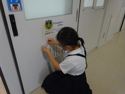 校長室入り口の「換気めくり板」も輪ゴムが切れていたため保健室に伝えると、早速、保健委員の子どもが一端回収→修理→再設置と素晴らしい対応をしてくれました。アフターサービスもバッチリの楓の森小の保健委員会です。