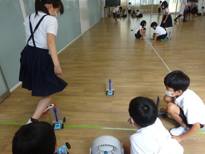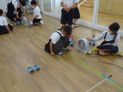 3年生の理科は、主幹教諭の一安先生(長く中学校で理科を担当)が担当しています。今の学習は「風とゴムの力のはたらき」です。多目的室で風で動く車を使った観察、実験を行っていました。子ども達は、風の力の大きさによる進む距離の違いなどの活動を行っていました。