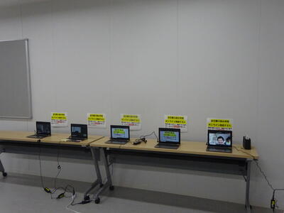 小会議室に1組から5組の5台の配信用タブレットが並べられ、次々に子ども達が入室してきています。学校で練習をしたteamsへの入室もスムーズにできているようです。子ども達同士で画面ごしに手を振り合うなど順調にテストが進んでいます。