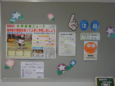 学校では、養護教諭の山下先生や米澤教頭先生が、朝や昼には機器を使って「暑さ指数」を測定し、職員室と保健室前の掲示板で確認・周知を行っています。また、特に暑い日は、給食中に教頭先生が外で遊ぶ際の注意事項などを放送され、各担任からも確認をしています。「暑さ指数」が「危険(31以上)」やそれに近い時には、昨年同様、外遊びを禁止としていますが、現在は、気をつけながら、子ども達は外遊びを楽しんでいます。