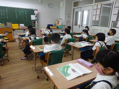 画数や字形がとりやすいひらがなから学習をはじめ、今日は「ふ」と「を」の学習。子ども達が書いている自分の名前も枠の中にしっかりとおさまり、字形も当初より整ってきて、筆圧もしっかりしていて、この3か月あまりの学習の成果のあとを見られます。今後の国語だけでなく、様々な学習や活動で使っていく中で定着を図っていくことなります。