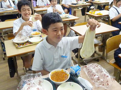 配膳後の各教室からは、あまった「ナン」争奪でじゃんけんをする声が聞こえていました。今日の給食は、いつも以上に楽しんだようでした。