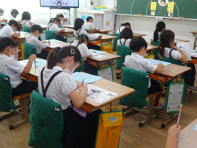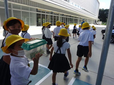 今日の1時間目の生活科「むしとなかよし」で、虫かごに入っている虫を観察して、絵を描いて学習をしていました。その後は、みんなで外にいって、虫を元の場所に戻しに行っていました。「逃がしたくないな~」と教室から出ない子どももいたようですが、最後は自然にもどしていたようです。
