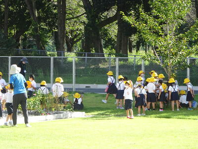 教育活動指導員の田中先生が付き添った男の子は、大きなカマキリと別れるのがさみしくて、エサとして入れていた大きなシャインマスカットをカマキリの口元に・・・。カマキリはその味を確かめて、意を決して、男の子がカマキリを離すと、カマキリはその男の子の後を追ってきたとのこと・・・。田中先生から「こんな物語があったんですよ」と話がありました。改めて子ども達の世界や感性はすごいなと思いました。