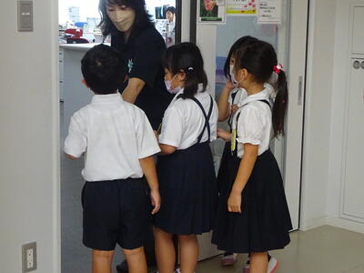 「〇〇をとりにきました。はいってもいいですか?」「〇〇をかえしにきました。はいってもいいですか?」「しつれいします」。クラスの配りかかりや保健かかり(クラスによって呼び方は違いますが)が職員室を訪れています。