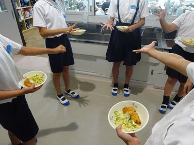 秋の味覚の「栗」の収穫量は、茨城県について熊本県は全国2番目だそうです。また、「つぼん汁」の名前の由来についても栄養教諭の橋本先生が音声解説入りのスライドを給食の時間にみながら昼食をとりました。
