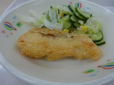 今日の給食には、天草の「さくら鯛(養殖マダイ)」の天ぷらがメニューの一つでした。