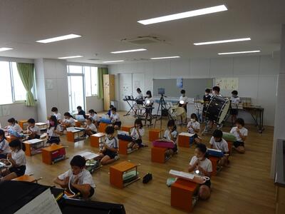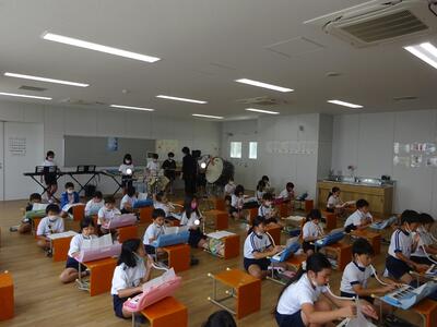 音楽室から歌声や合奏の音が聞こえてくるようになりました。音楽の授業は、感染予防対策の影響を特に受ける教科のため、歌はもちろん、リコーダーや鍵盤ハーモニカを使う活動については制限せざるを得ない状態でした。その中で、山下先生(音楽専科)も色々と方法を工夫し試行錯誤しながら、音楽の授業を行っていました。