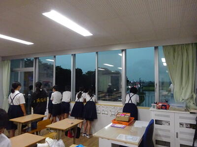 雷の音や稲光などもあり、登校してきた子ども達も、雷の度に反応していました。6年生の教室では、いつもと変わらずトランプをしたり、宿題?!をしたりする光景がみられましたが、外の稲光をタブレットで録画記録する強者も見られるなど、冷静な対応の6年生の姿がありました。