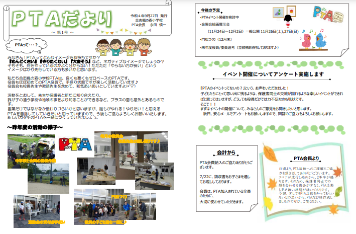 今回、現在のPTA活動を知っていただく一つとして、「PTAだより 第1号」が役員の方々によって発行されました。