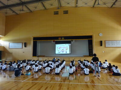 6年生は、「インターネットとのつきあい方」について、3時間目に体育館で学習をしました。数名の保護者の方々も参加していただきました。