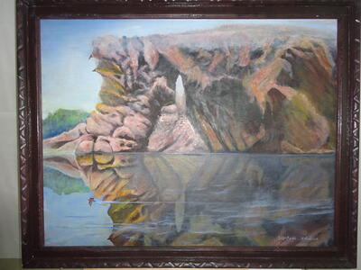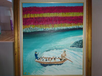 今回の展示している作品のテーマは「山」ですが、中原茂敏さん作の「獅子岩」(2006年)で、天草の牛深にある獅子岩が海面に映り込んでいる作品(写真左)や、木下今朝義さん作の「彼岸花」(2002年)で、球磨川くだりを描かれている作品(写真右)をもとに藏座さんからアドバイスをもらったとのことでした。