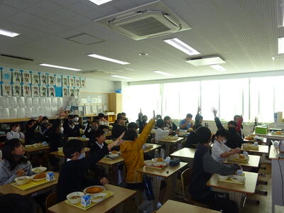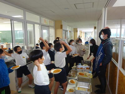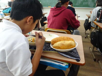 中学校の学年閉鎖にともない、各クラスには、揚げパンの「おまけ」が分けられていました。低学年の子ども達のパンと違い、中学生のパンはサイズも大きいため、半分にして低学年のサイズと同じぐらいです。小学校の教室のあちらこちらから、おまけの「揚げパン」への歓声が聞かれ、その後は、ジャンケンでの争奪戦?!がくりひろげられていたようでした。おかげで、おまけの「揚げパン」も完食されたようです。おそるべき「揚げパン」の人気ぶり!!でした。