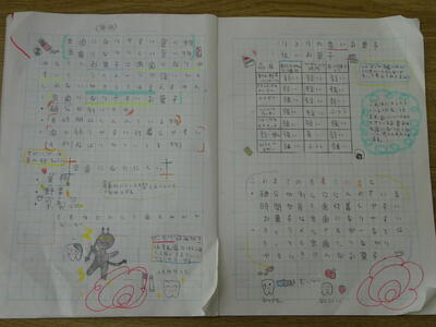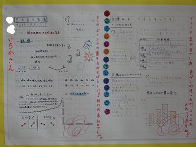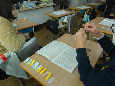 今回もそれぞれのお気に入りのページを開き、他の子ども達が付せんに友達の自学のいい所を書いていました。子ども達は、友達が書いてくれた付せんが次の励みになるようで、自学ノートに勲章のように張ってありました。
