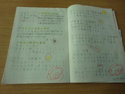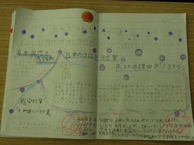 その後、これはスゴいという友達のノートにシールを貼って、今回の自学コンクール3名が拍手でたたえられました。学習したことの復習や学習後にさらに調べたこと、それぞれが興味があること(「おせち」「新型コロナウイルス」など)など、自学の内容も豊富で、まさしく「自ら学ぶ」ノートとなってきている感じがしました。担任の宮田先生も前回よりさらにレベルアップしていると話されていましたが、次回も楽しみです。
