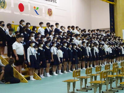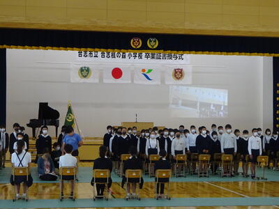 修了式の最後には、全校児童で校歌を斉唱しました。実は、開校以来、全校児童で校歌を歌ったのは、今回が初めてでした。初めての校歌で、やや戸惑いながらでしたが、4月からの新学期に向け期待ができる校歌となりました。
