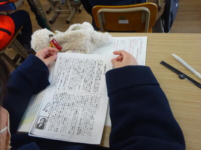 1時間目、6年生教室では担任の先生による最後の授業が行われていました。昨年度の開校時に合志楓の森小学校に初任者として赴任した杉本悠真先生は、5年生からの2年間、この学年を担任しています。今年は、学年理科専科として6年生3クラスの子ども達にも関わっていました。教師としての初めての卒業生を送り出す前日の最後の授業では、自身が小学校卒業時にかいた文集をもとにした内容でした。目の前の担任の先生が自分達と同じ6年生の時に書いた卒業文集を子ども達はしっかりと読んでいました。