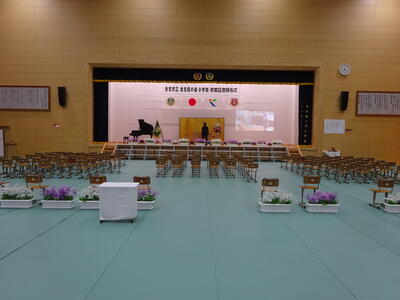 昨日の午後から5年生と先生方で式場の準備を行い、今朝は雨模様の中、先生方も早くから最終調整をして頂いています。式場となる体育館も今日の主役となる卒業生を迎える準備が整っています。