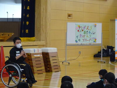 3月6日(月)に行った「あすチャレ!ジュニアアカデミー(日本財団パラスポーツサポートセンター主催)」(前回HPブログはこちら)に続き、2回目を20日(月)に実施しました。前回は、5・6年生でしたが、今回は、4・5年生を対象に行いました。講師は、前回と同じ「ブッキー」こと伊吹祐輔さんです。5年生の子ども達からは「おかえりブッキー」と掲示も用意し、3週間ぶりの再会を楽しみました。