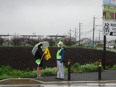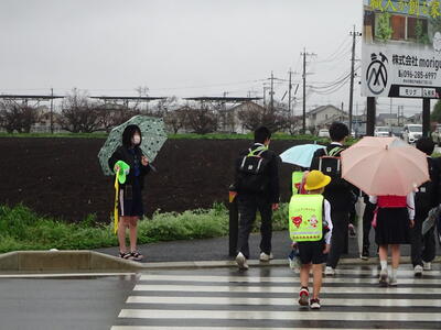 24日(金)修了式が、登校最終日、雨の中、小学生に「おはよう」とあいさつをしながら、横断歩道での見守りをしてくれていました。