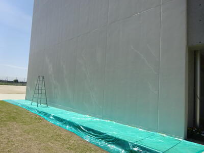 合志楓の森小学校・中学校の校舎が建設されて2年が経過しました。昨年度も施工業者による1年目点検とその後の補修工事が行われましたが、2年目点検後の補修工事が27日から4月5日までの期間で行われています。