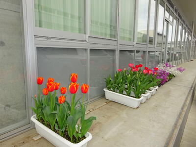 4月11日(火)の入学式(小学校は午前中、中学校は午後)にピッタリのチューリップの色とりどりの花も出番待ちをしています。