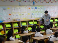 4/21、算数の授業です。1年生は、数字の書き方の学習でした。お手本の数字を見て、なぞり書き、写し書きができました。先生が「黒板に書ける人」というと、「ハイ!」と元気に手を挙げ、指名された子が黒板に丁寧に書くことができました。