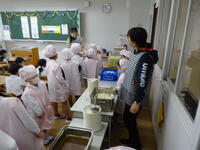 1年生はいよいよ今日から給食が始まりました。ちなみに今日のメニューはカレーライスとサラダとお祝いゼリーでした。当番さんはさっそくエプロンに着替えてコンテナにみんなの給食を取りにきました。先生から準備の仕方についてしっかり話をきいて上手に準備できました。(文責 教頭 米澤)