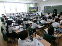 4月19日(水)、2年生がタブレットPCを見ながら花の絵を描いています。