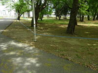 現在、菊池恵楓園内では写真の通り子ども達の通り道に沿って「スズランテープ」を通しています。カントリーパークが同様の対策をしているとかで、合志市の農政課の方で取り付け作業をしていただいています。スズランテープの色はイノシシが嫌がる青色です。(赤が嫌がるという説もあるみたいです)(文責 教頭 米澤)