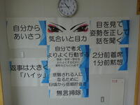 3階にある6年教室の廊下の奥に6年生の学年目標が掲示してあります。先日の授業参観でおみえになった方はすぐ気づかれたと思いますが、「気合いと目力」が遠くからでも目に飛び込んできます。今年も6年生が「あいさつ」や「無言清掃」「1分前黙想」など学校全体の手本として頑張ってくれるものと楽しみです(教頭 米澤)