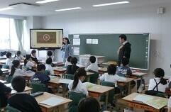 3年外国語活動の授業です。3年生では、英語講師の沖先生と担任によるティームティーチングで授業を行っています。主体的に外国語を用いてコミュニケーションを図ろうとする子どもたちを育てたいと思います。(校長 佐藤 政臣)