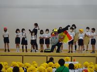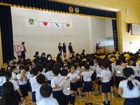 今日は新入生歓迎会を行いました。まずは全校児童が体育館に集まり、全校でじゃんけんゲームや〇×クイズを行いました。今日は「じゃんけん大魔王」も登場しました。感心したのは、体育館に入場するときどの学級でも上靴をそこを合わせてきれいに並べていたことです。小さいことですがこういう習慣が大切だと思っています。集会の後は、みんな校内の芝生のところでお弁当を食べました。