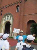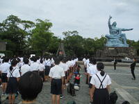 平和講話後、平和祈念像の前で、平和集会を行いました。千羽鶴を納め、平和を誓い、「折り鶴」を歌いました。その後、ボランティアガイドの皆様の案内で、フィールドワークを行いました。私は、4組4班に同行しました。ボランティアガイドの芳川さんは、最後に、被爆者の吉田勝二さんの言葉で締めくくられました。吉田さんは次のように言いました。「平和の原点は、人の痛みがわかる心をもつことです」と。子ども達は、暑い中、最後までしっかりと心と目と耳で聴き、しっかりメモをとっていました。 (校長 佐藤 政臣)
