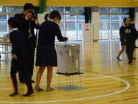6年生が社会科の授業の一環で合志市選挙管理委員会と明るい選挙推進協議会の協力の下「出前選挙授業」を行いました。冒頭は、選挙管理委員会の方から説明を受け模擬投票を行いました。模擬投票は「憧れるのをやめましょう。自分の一票でつかめ給食総選挙」ということで、6年の担任の先生方が立候補者よろしくそれぞれのメニューの応援演説を行いました。その後は実際に投票と開票を行いましたが、1番目の投票者が立会人と空の投票箱を確認するところから実際の選挙と全く同じ体験を行いました。今回の投票では「ホットドッグ」がトップ当選で(他は「カレー・ナン」「やきそばパン」「たこやき」がありました)今後給食のメニューとして出されることになるそうです。(教頭 米澤)