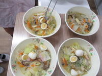 本日の給食のこんだては、太平燕でした。うずらの卵が入っていましたが、低学年(1,2年)の太平燕にはうずらの卵がカットされていました。1個、1個、丁寧に包丁でカットされたということでした。1,2年生で268名在籍しています。1人4こ程度卵が入っていますから、1000個以上の卵をカットされたことになります。子どもたちは、感謝して食べていました。また、栄養教諭が作成した給食指導用のプレゼン資料を紹介します。別添資料をご覧ください。