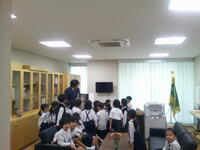1年生は、校内を探検しました。学校には、教室以外にどんな部屋があるのかな?職員室、事務室、保健室などなど・・・・そして、校長室にも来ました。